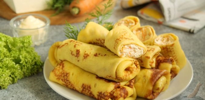 Печінкові млинці з начинкою з сиру, моркви по-корейськи та яєць
