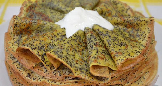 Млинці виходять солодкими, смачними та дуже апетитними на вигляд. Вони прості у приготуванні та бюджетні. Лимонно-макові млинці можна подавати до столу зі сметаною або джемом.