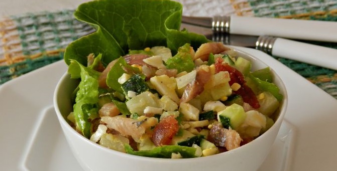 Салат виходить дуже ситним. Для його приготування знадобляться прості інгредієнти й небагато часу. Картопляний салат з копченою рибою має апетитний вигляд та чудовий аромат. Така страва точно Вам сподобається.