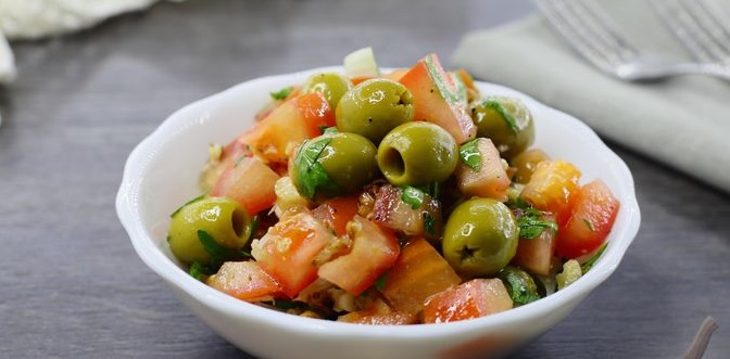 Такий салат можна готувати кожного дня. Він дуже простий та бюджетний. Салат з помідорами, цибулею, оливками та горіхами оригінальний на смак та апетитний на вигляд.