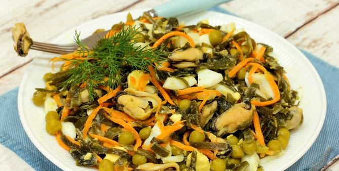 Салат з морською капустою, мідіями, морквою по-корейськи та зеленим горошком