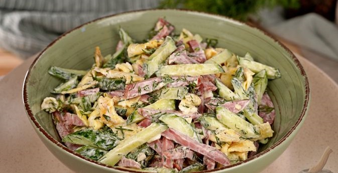 Салат можна готувати для сім’ї, або подавати до святкового столу. Він дуже простий та смачний. Салат з ковбасою, огірками та яєчними млинцями має апетитний вигляд та чудовий аромат.