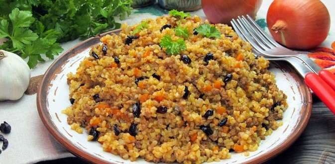 Булгур з м’ясним фаршем, томатною пастою та барбарисом