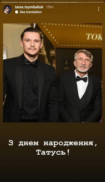 На світлині, яку Тарас Цимбалюк запостив в Instagram-stories, він позує у стильному чорному костюмі. Поруч з актором знаходиться його батько. Чоловік теж позує у костюмі чорного кольору та мило усміхається. Також зірка українського шоу-бізнесу показав, як привітав батька з 68-річчям.