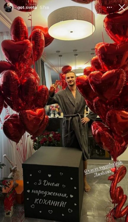 Тарас Цимбалюк не став розсекречувати, що саме знаходилось в тій коробці. Він подякував коханій за такий приємний сюрприз та додав, що це найкращий його день народження. А ще Тарас Цимбалюк подякував українським захисникам за можливість святкувати 34-річчя в рідній країні.