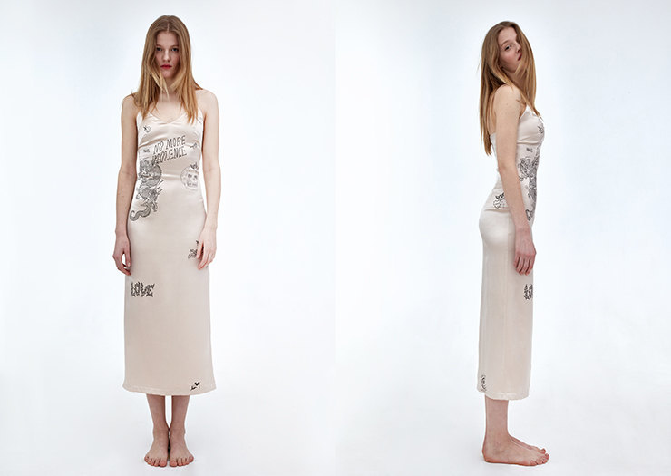 Тату-принти прикрашають верхній одяг, сорочки, топи, сукні, спідню білизну і мереживні комбінезони. Гама колекції залишилася в рамках звичних для TTSWTRS білого, бежевого і блакитного, а ось до традиційних матеріалів – шовку, мікромодалу, сітки і деніму – додалися міцні поліуретанові тканини.