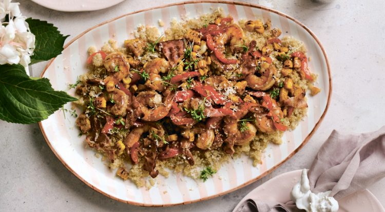 Кіноа заливаємо гарячою водою та залишаємо на декілька хвилин. Потім зливаємо рідину та знову додаємо 300 мл. гарячої води. Солимо, перчимо та варимо до готовності на повільному вогні.