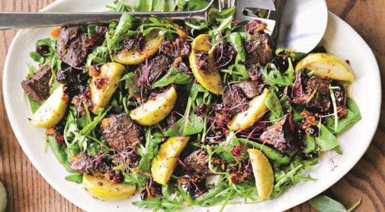 Листя салату викладаємо на тарілку. Додаємо смажену печінку та яблука. Салат поливаємо апельсиновим соком з журавлиною. Акуратно перемішуємо та подаємо до столу. Смачного!