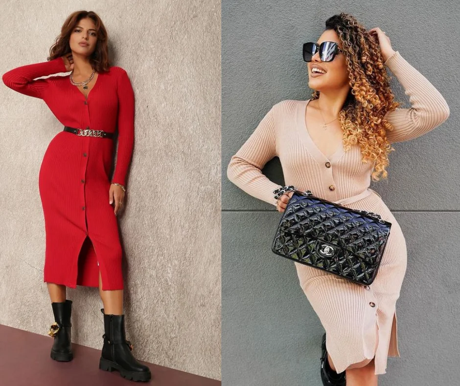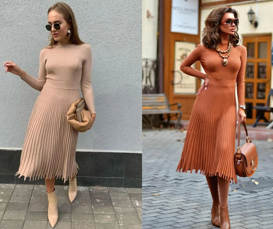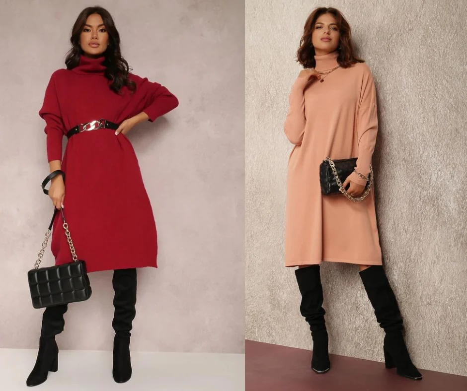 Сукня, схожа на довгий светр – це модний варіант для осені. Моделі чудово виглядають, демонструючи ніжки – надбання кожної жінки. Сукня-светр гарно буде виглядати з високими чобітьми-ботфортами або грубими черевиками. Можна створити образ у стилі хіпі-шик, доповнивши капелюхом в тон взуття. Ви можете додати ремінь, щоб підкреслити талію або залишити сукню вільною.
