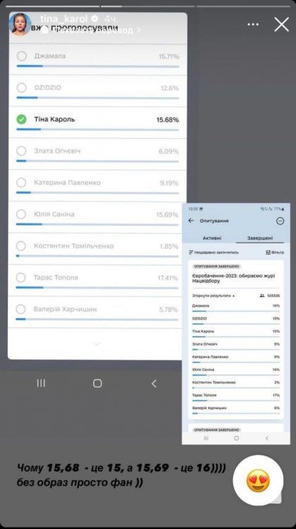 За результатами голосування у “Дії” вона набрала 15,68% голосів, водночас солістка “The Hardkiss” – 15,69%. Втім, Тіну Кароль дуже обурило те, що її конкурентці округлили голоси до 16%, а їй – до 15%. Про це виконавиця повідомила в Instagram-stories.
