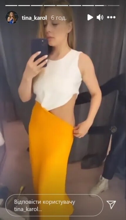 Вбрання артистки складається з двох частин. Верх білосніжного кольору, а низ яскраво-жовтий. Свій стильний образ Тіна Кароль підкреслила легким макіяжем та красивими масивними сережками.