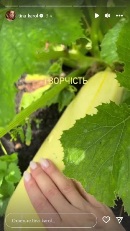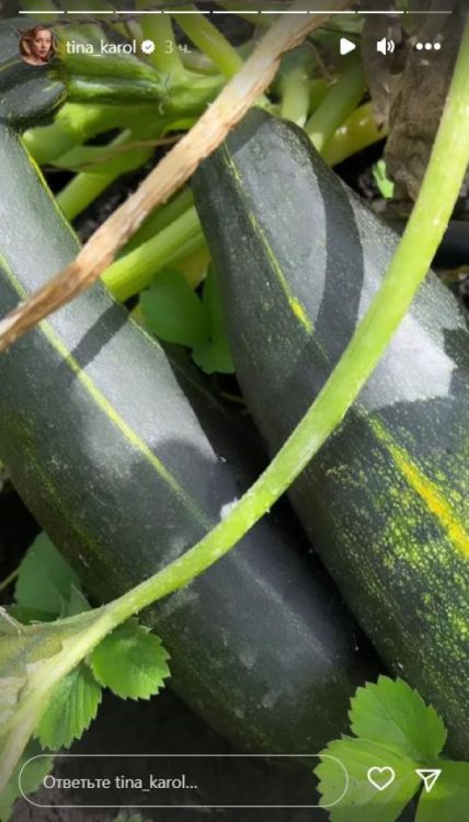 В Instagram-stories Тіна Кароль опублікувала відео, в якому продемонструвала чималі кабачки. Співачка неабияк задоволена, що їй вдалося виростити такі чудові овочі. Окрім кабачків на городі в Тіни Кароль ростуть огірки, помідори та багато чого іншого. “А кого я знайшла? Лалала, стережись!” – говорить у відео співачка.