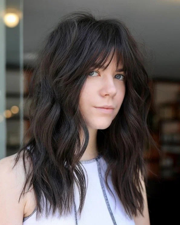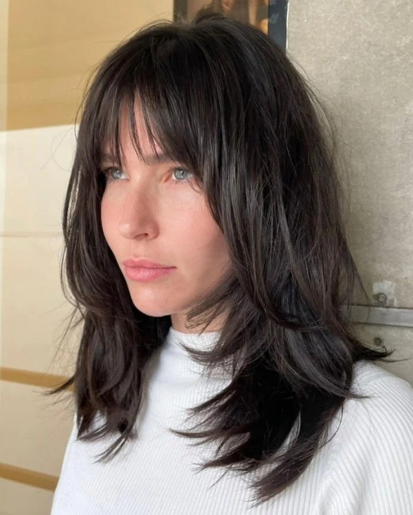 Досягти максимальної гармонії в образі допоможе “рвана” стрижка середньої довжини в одній комбінації з тонким чубчиком. Цей варіант стрижки має омолоджуючий ефект, а також робить обличчя стрункішим, більш чітким і пропорційним.