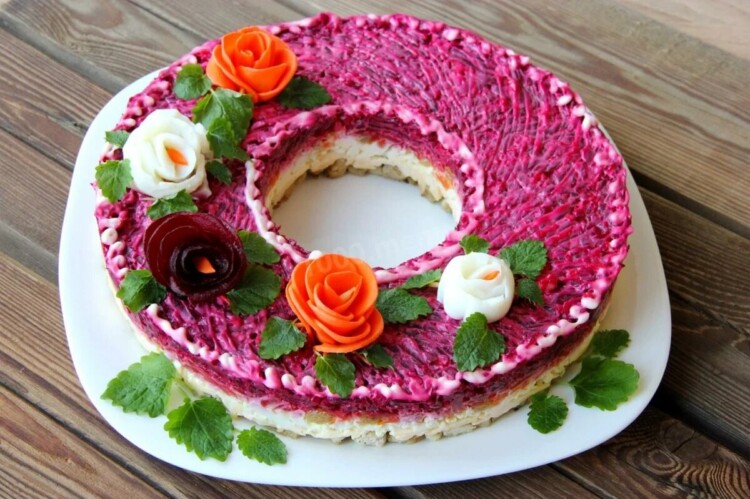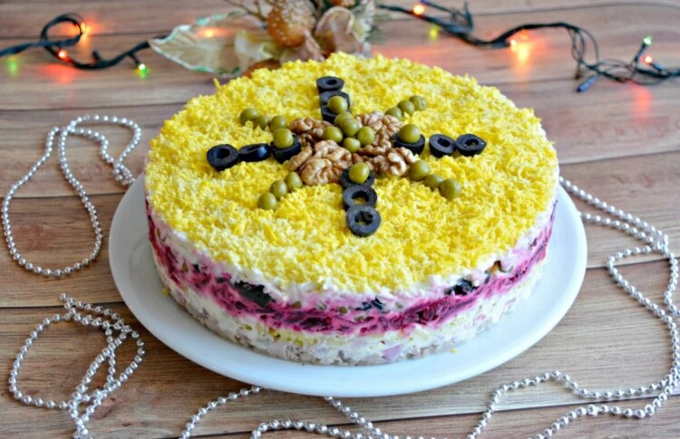 Оригінальна заміна і серйозний конкурент оселедецю під шубою. Салат дуже смачний, він займе почесне місце на вашому святковому столі. Виглядає як торт. До того ж, такий салат можна приготувати заздалегідь, так як він стає смачнішим, коли постоїть і просочиться.