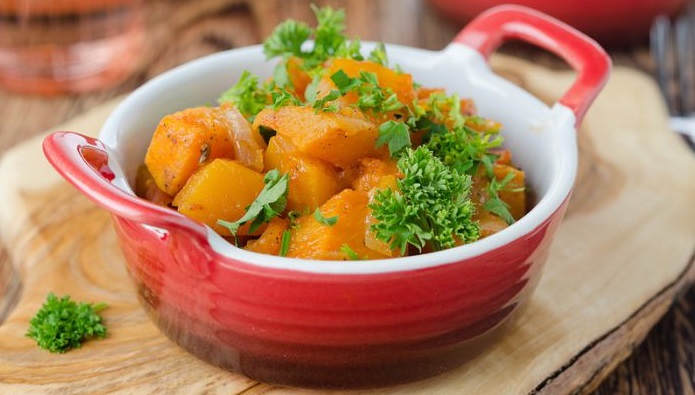 Гарбуз є надзвичайно корисним інгредієнтом. З нього можна приготувати безліч апетитних страв. Тушкований гарбуз в томатному соусі стане улюбленою стравою всіх вегетаріанців. Він має чудовий смак та виходить дуже ніжним й ситним.
