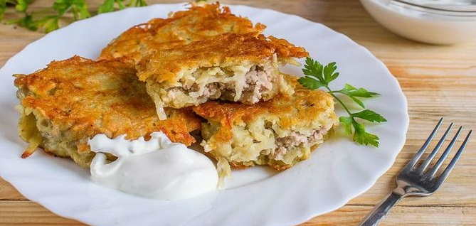 Таких дерунів Ви ще точно не куштували. Їхня особливість в тому, що вони готуються з м’ясом. До столу страва подається зі сметаною або соусом. Деруни мають рум’яну скоринку та апетитні на вигляд.