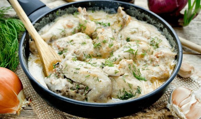 Обсмажену цибулю перекладаємо в каструлю. Курячі стегна смажимо до готовності. Потім відправляємо їх до цибулі. Додаємо сметану, молоко та невелику кількість води.