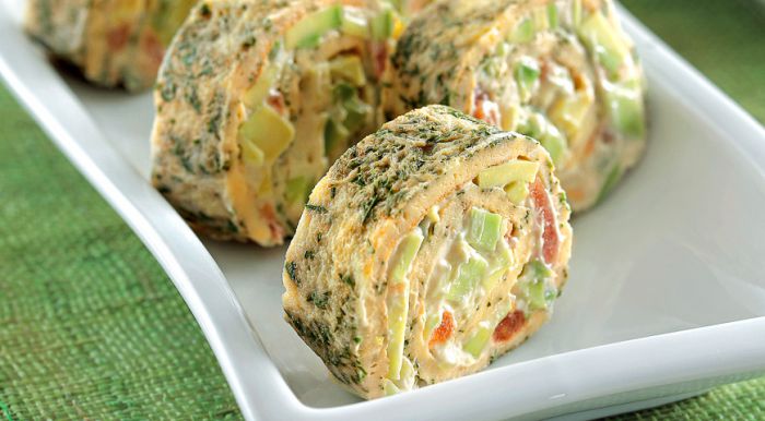 Тим часом дістаємо підморожені плавлені сирки й разом з часником натираємо на тертці. Змащуємо ними омлет та посипаємо нарізаним кропом. Потім викладаємо нарізані овочі й щільно загортаємо в рулет.