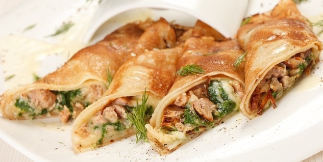 На кожний млинець викладаємо м’ясну начинку й акуратно їх загортаємо. Потім млинці викладаємо на парову решітку в мультиварці. Готуємо їх приблизно 30 хвилин. До столу млинці подаємо гарячими. Смачного!