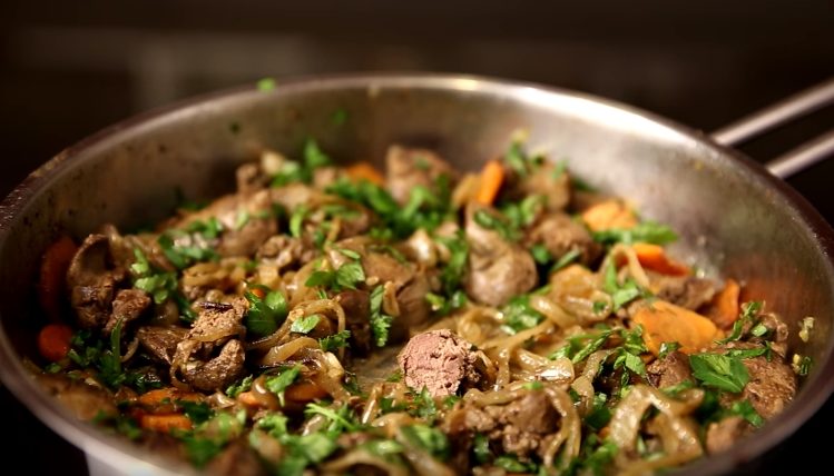 Потім додаємо гриби. Всі інгредієнти тушкуємо під кришкою на середньому вогні. Печінку нарізаємо кубиками й обсмажуємо на вершковому маслі в окремій сковорідці.