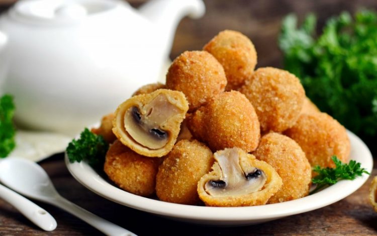 Спочатку гриби обвалюємо в борошні, а потім занурюємо в яєчно-молочну масу. Щедро посипаємо панірувальними сухарями та занурюємо у фритюрницю з достатньою кількістю олії.