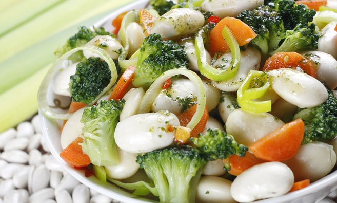 Квасолю замочуємо в холодній воді та залишаємо на цілу ніч. Потім варимо її до готовності. Моркву та броколі теж відварюємо у підсоленій воді. Овочі нарізаємо на шматочки.