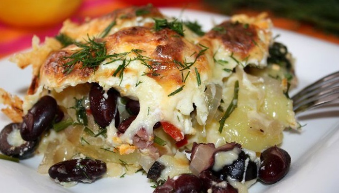 Потім викладаємо квасолю та нарізані яйця. Знову змащуємо сметаною та посипаємо сиром. Запіканку випікаємо 30 хвилин при температурі 200 градусів. Смачного!