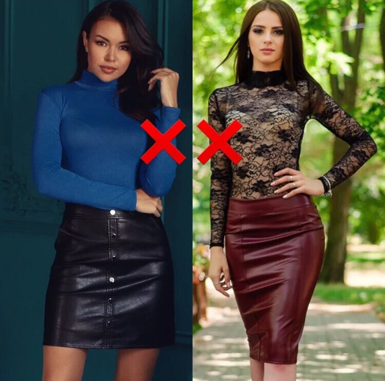 Шкіра – це матеріал, який став трендом 2020 року. Однак, не всі фасони шкіряних спідниць є актуальними у цьому сезоні. На фото-прикладах, наведених нижче, наочно показано, як не потрібно одягатися.