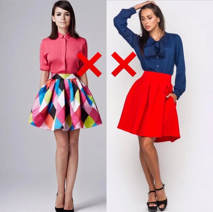 На фото-прикладах представлене невдале поєднання речей в образі. Спідницю даної моделі не можливо вигідно обіграти за допомогою модної кофти або туфлів.