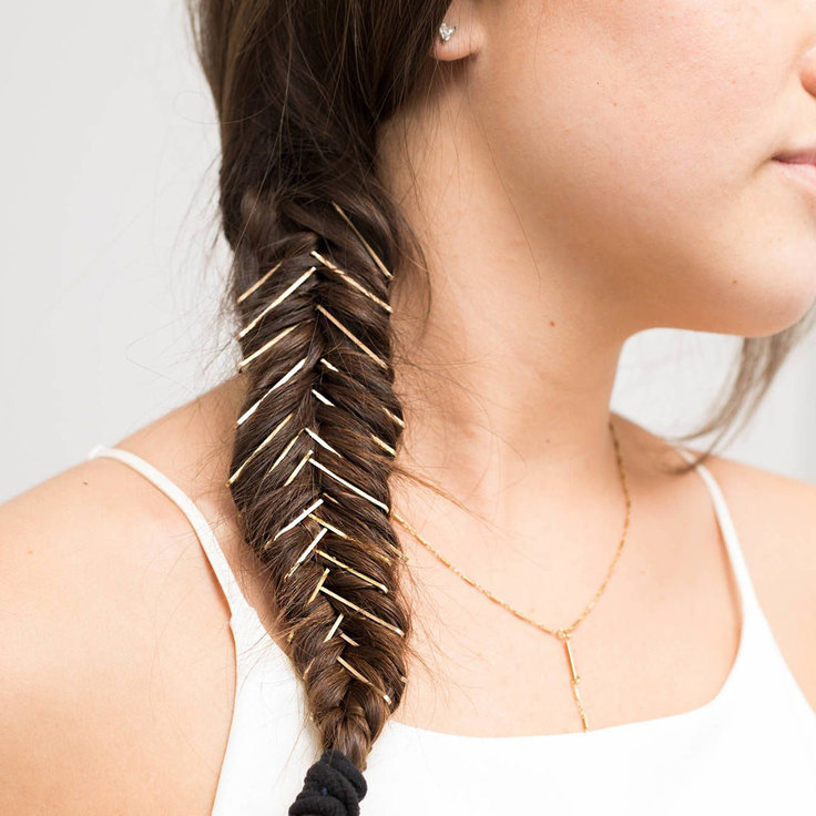 Основний прийом, який можна використовувати, якщо твоє волосся середньої довжини або нижче, – зафіксувати пасма шпильками ззаду, прибравши їх таким чином від обличчя. Або заколоти збоку, асиметрично або ж по обидва боки обличчя. Це зробить твій образ святковим, але не нарочито ошатним. Роби ставку на лаконічність зачіски – незвично розташовані невидимки все одно будуть приковувати погляди.