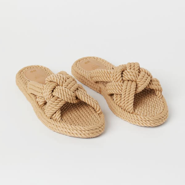 Знову класика і база, а не ще один сезонний винахід. Босоніжки з рафії асоціюються з канікулами на сонячній Майорці, сангрією в величезному келиху і бірюзовим морем на тлі. На що звернути увагу, якщо стандартні босоніжки на танкетці з рафії у вас вже є? На сандалі, які нібито сплетені вручну з рибальських канатів ідеального бежевого кольору.