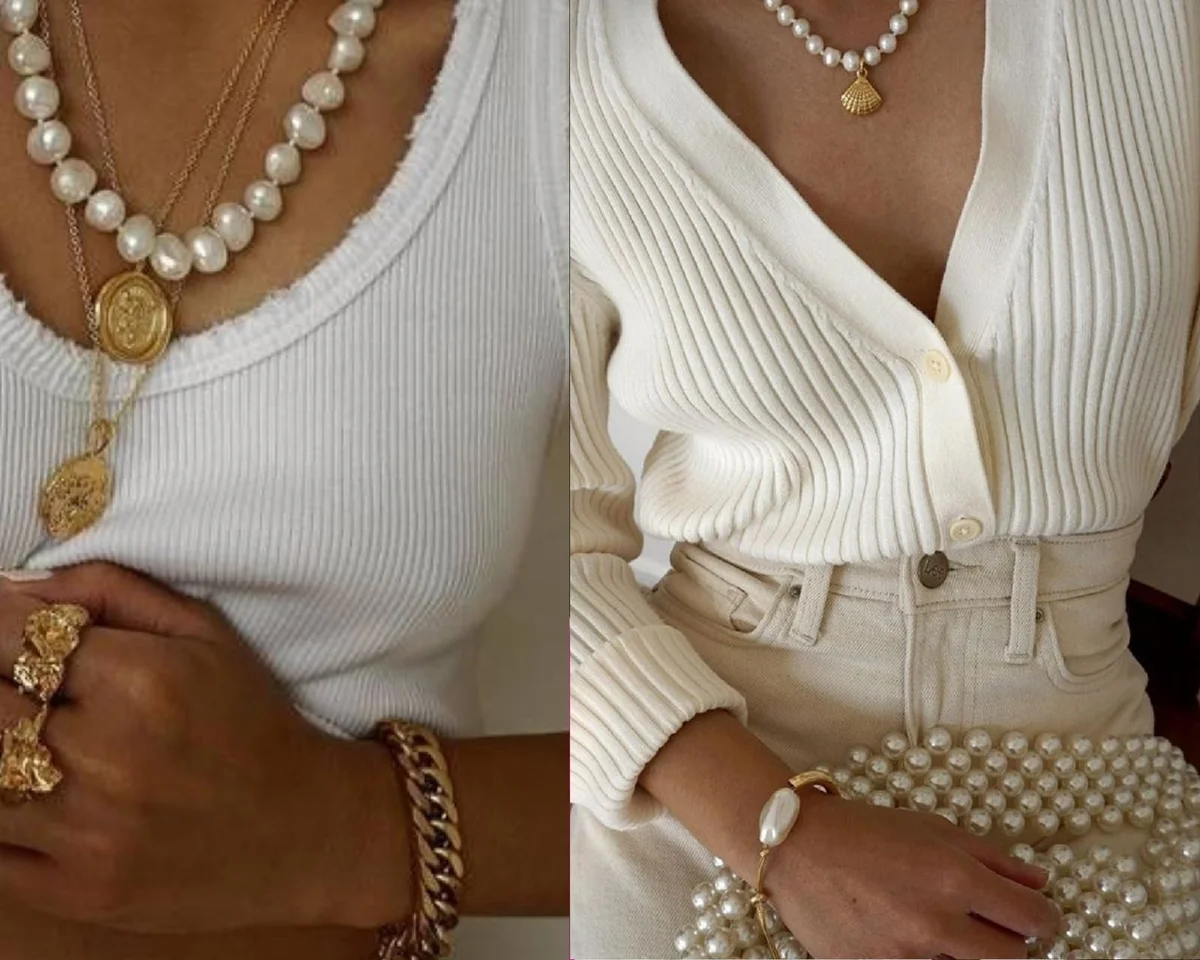 В 2021 знову робимо ставку на бароковий стиль перлів але круглі перли теж можна «врятувати», варто лише таке кольє скомбінувати з сучасними великими ланцюгами.