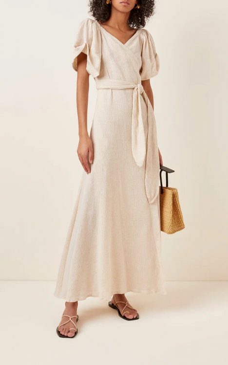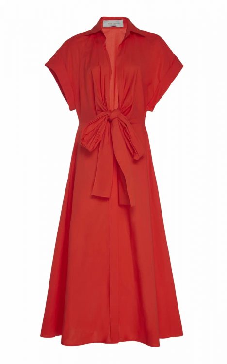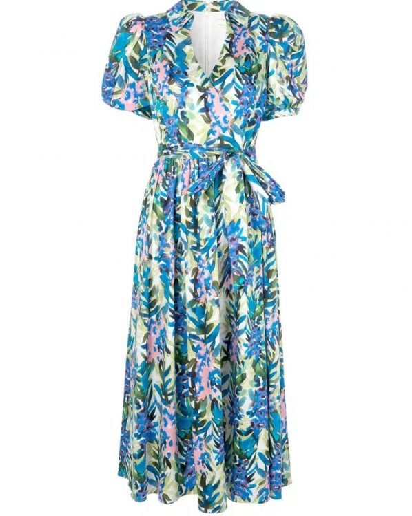 Наступна сукня з бавовни має крій на запах з акцентними рукавами «ліхтариками» та тонким ремінцем на талії, який найкраще зав’язувати на об’ємний бантик.