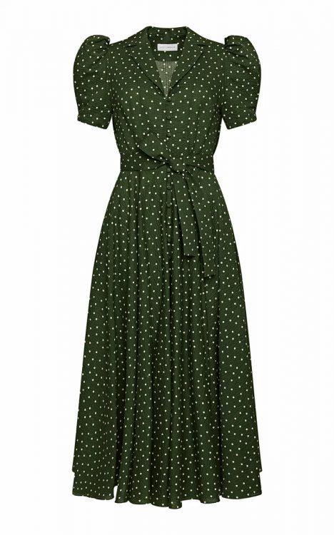 Сукня для святкового заходу цього літа може виглядати наступним чином: бавовняна тканина в горошок, модель на ґудзиках, пишні короткі рукави, тонкий пояс, що підкреслює осину талію.