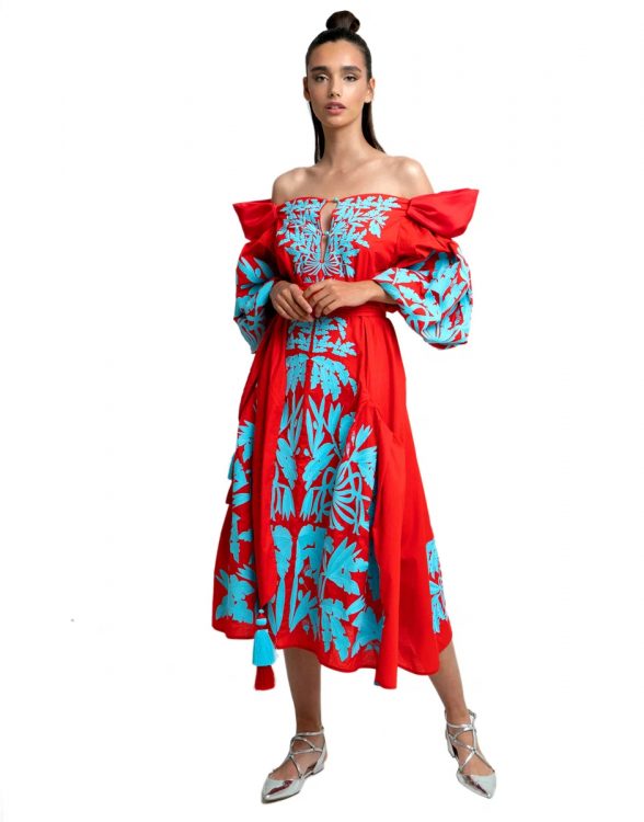 Вишукана сукня зі спущеними плечима у червоно-синьому кольорі, пишною спідницею та силуетним ліфом зведе з розуму не лише модниць, а й осіб протилежної статі. Продуманий крій виробу чудово «сідає» на будь-який тип фігури, коригуючи, де треба недосконалості та демонструючи переваги.