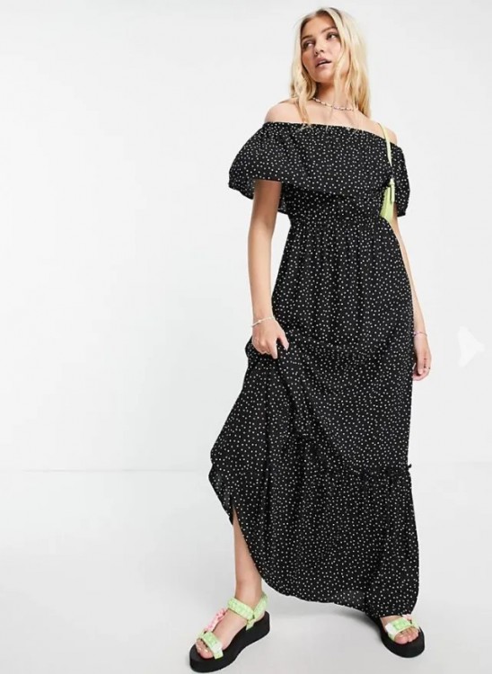 Універсальний варіант на кожен день – ярусна сукня з великим воланом на грудях. Ми вибрали варіант з актуальним літнім принтом – дрібним горохом.