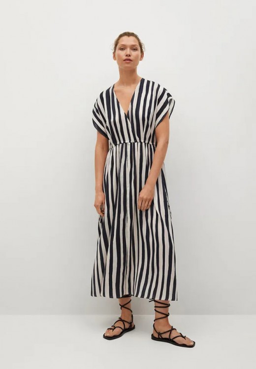 Легка сукня у вертикальну смужку стане чудовою основою для модного літнього образу. З нею однаково добре виглядають як нейтральні, мінімалістичні аксесуари, так і більш яскраві, трендові. Наприклад, це можуть бути сережки-підвіски з кольоровими каменями.