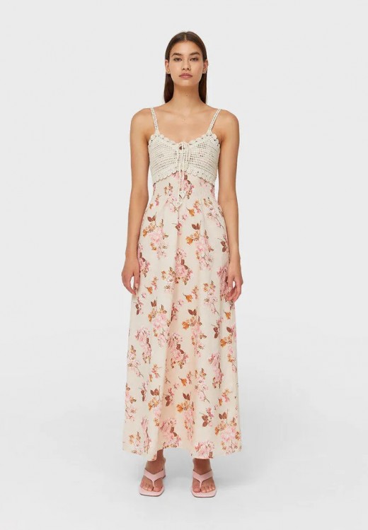 Комбінована сукня-сарафан – мастхев для спеки. У ній можна піти і на побачення, і на прогулянку в парк, і на модну вечірку. Верх сукні, виконаний в техніці кроше, і ніжний квітковий принт додадуть образу легкості та романтичності.