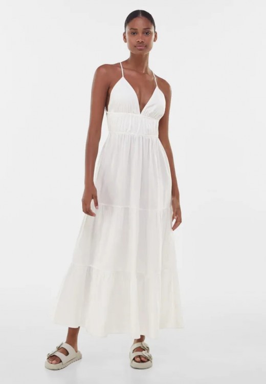 Ярусний білий сарафан підкреслить талію, витончені ключиці і шию. До нього ідеально підійде строката косинка, плетена сумка з рафії і масивні сандалі.