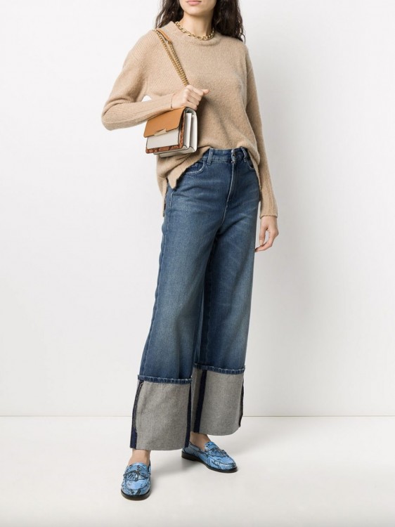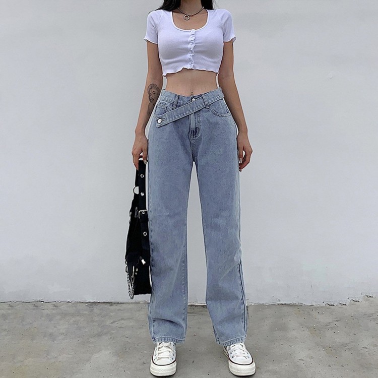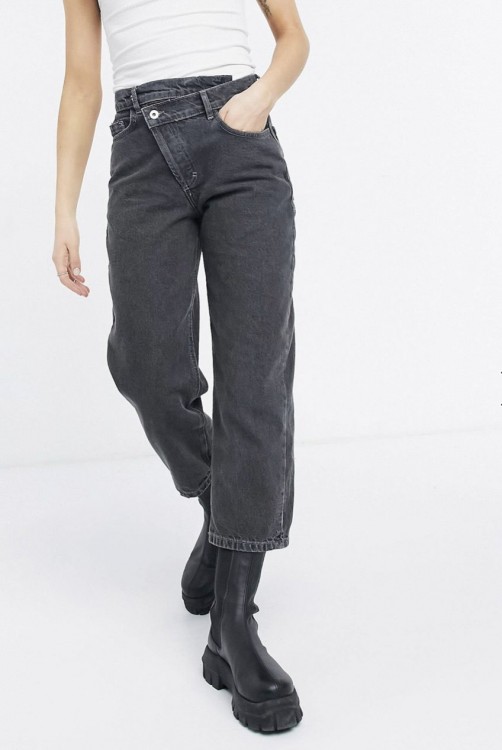 Ще одна незвичайна модель – з асиметричним поясом. Здобувши популярність в інстаграмі, ці джинси сподобалися дизайнерам брендів мас-маркету. Носіть їх з кроп-топами або з футболками і сорочками під заправку, щоб пояс залишався зверху. А в холодний сезон — з оверсайз-джемперами чи кардиганами, теж заправляючи їх усередину.