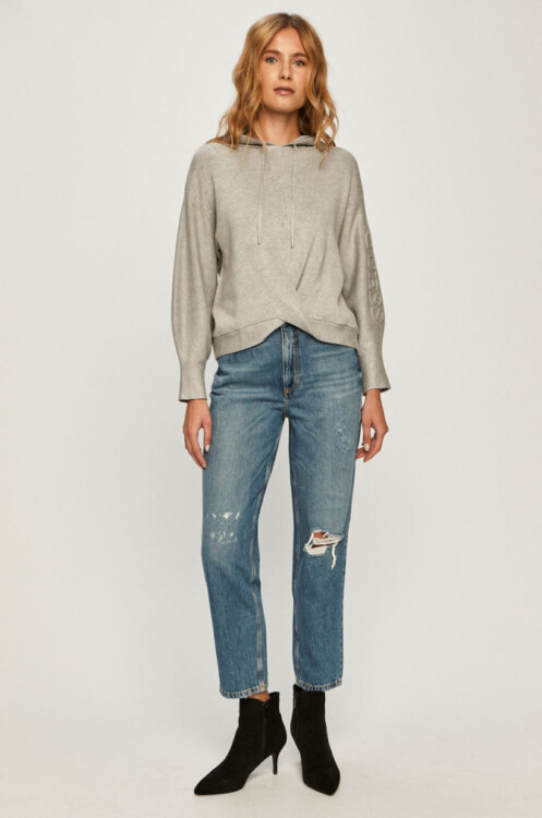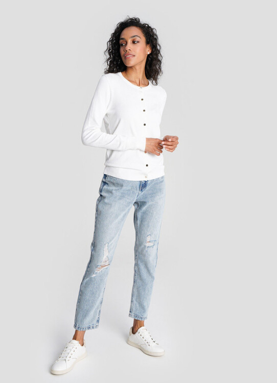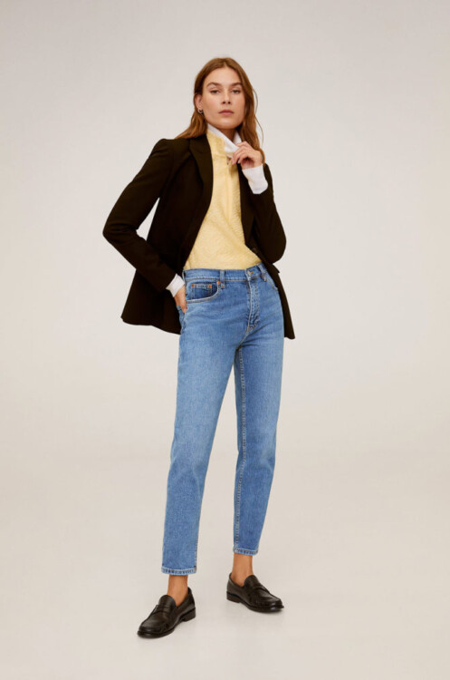 Джинси мом в холодну пору року можна сміливо поєднувати з тонким гольфом, теплим кашеміровим джемпером або приталеним топом, щоб підкреслити витонченість та жіночність фігури. Найкраще вибирати дану модель в білому або ніжно-блакитному відтінку.