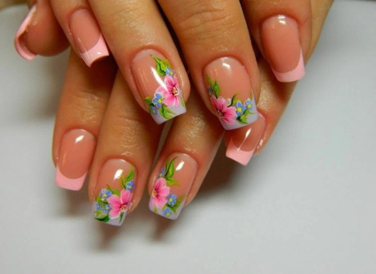 Ніжно, акуратно але оригінально виглядають різні квіткові візерунки та композиції, що прикрашають кінчик нігтя та розміщені на молочній або бежевій основі.