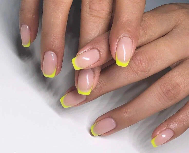 Літо – час для яскравих образів. Кольори неприродної, насиченої яскравості привертають увагу та піднімають настрій. Такий френч чудово підійде для сміливих неординарних дівчат, які не бояться заявити про себе. Посмішка може бути виконана з неонового оранжевого, рожевого, жовтого або салатового лаку. Можна також прикрасити вільний край плямами, краплями та іншими фігурами.