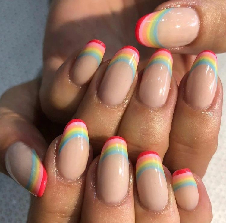 Якщо Ви хочете виділитися, бути яскравою та незвичайною – пофарбуйте кінчики кожного нігтя у різні кольори. Перевага такого френча в тому, що він однозначно поєднуватиметься з більшістю речей у гардеробі.