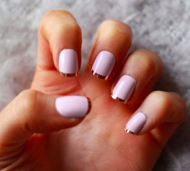 Френч із металевою посмішкою, як і традиційний, підходить для будь-якого випадку, виглядає ошатно та святково. Кінчик із ефектом металу створюють за допомогою втирання. Оригінально виглядає матова нігтьова пластина, обрамлена глянсовою металевою смужкою.