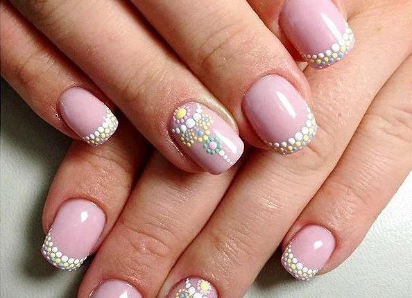 Акуратну усмішку можна намалювати за допомогою дотсів різного діаметру. Крапочки акуратно наносять на вільний край нігтя. Особливо добре така технологія виглядає на нігтях мигдалеподібної форми.