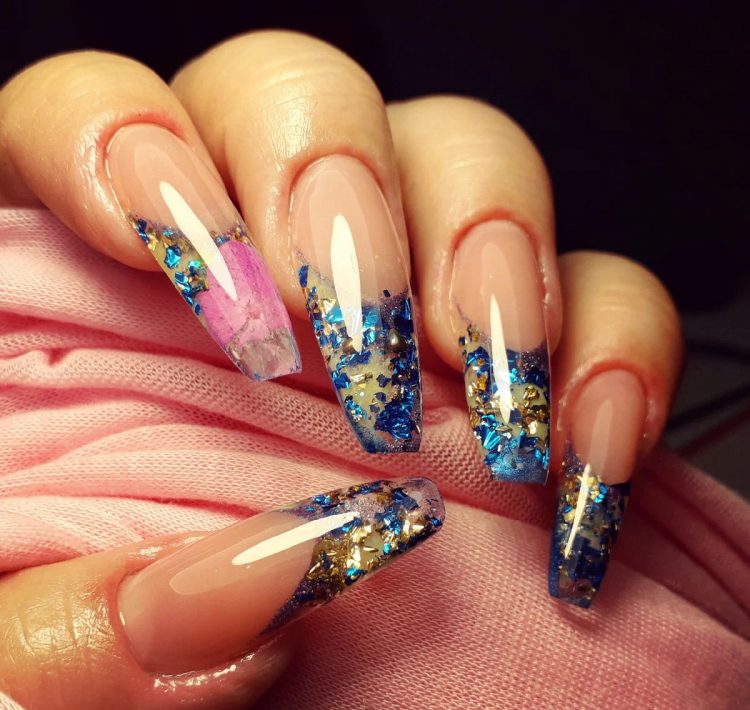 Акваріумний декор – модний тренд 2022 року. Це яскравий, нестандартний дизайн, який можна реалізувати виключно на нарощених нігтях. Вільний край прикрашається різним декором – комбінаціями блискіток, камінчиків, вкраплень, що виблискують на зеленій, синій або бірюзовій основі. Все це нагадує водну гладь, що світиться під сонячним промінням.