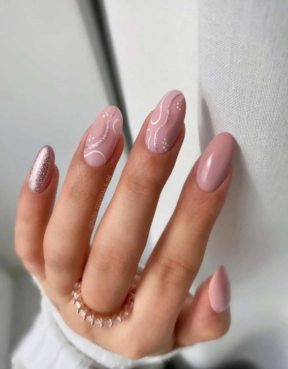 Рожеві нігті з абстрактними завитками – ідеальне поєднання розкоші та жіночності. Блискучі акценти та білі деталі чудово поєднуються між собою.