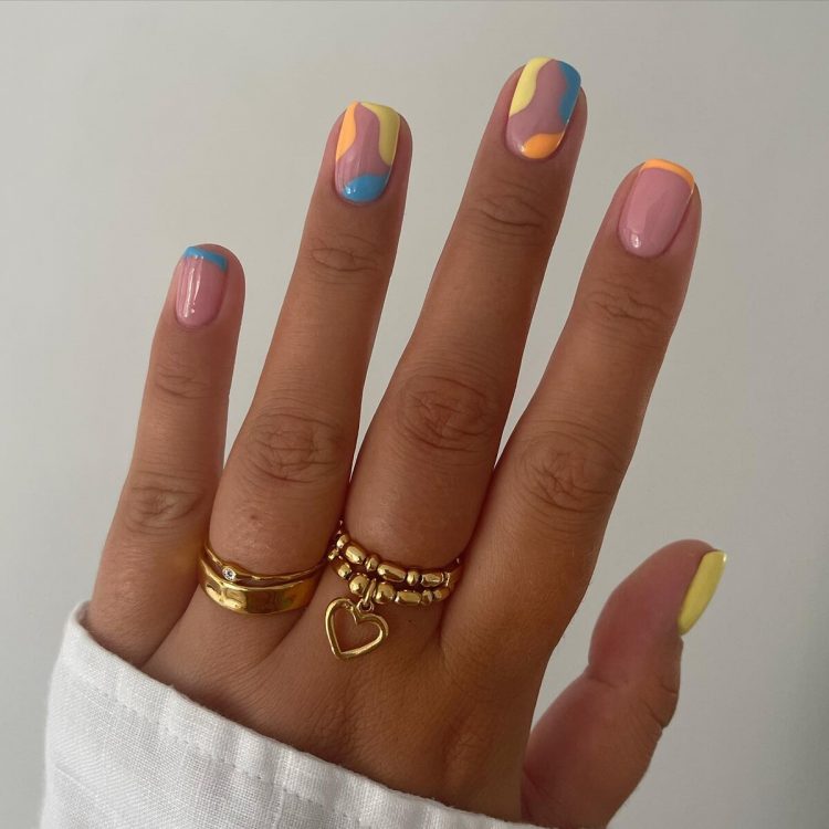 Пастельні жовті, помаранчеві та сині завитки та французькі кінчики чудово підійдуть для створення оригінального та барвистого манікюру, який чудово виглядатиме на нігтях будь-якої довжини, у тому числі і на коротких.