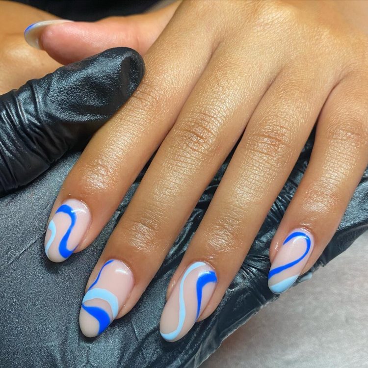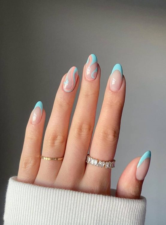 Блакитний та персиковий відтінки ідеально поєднуються один з одним. Вони чудово підійдуть для створення ніжного та вишуканого хвилястого дизайну нігтів, який не буде кидатися в очі, але при цьому стане справжньою окрасою образу.